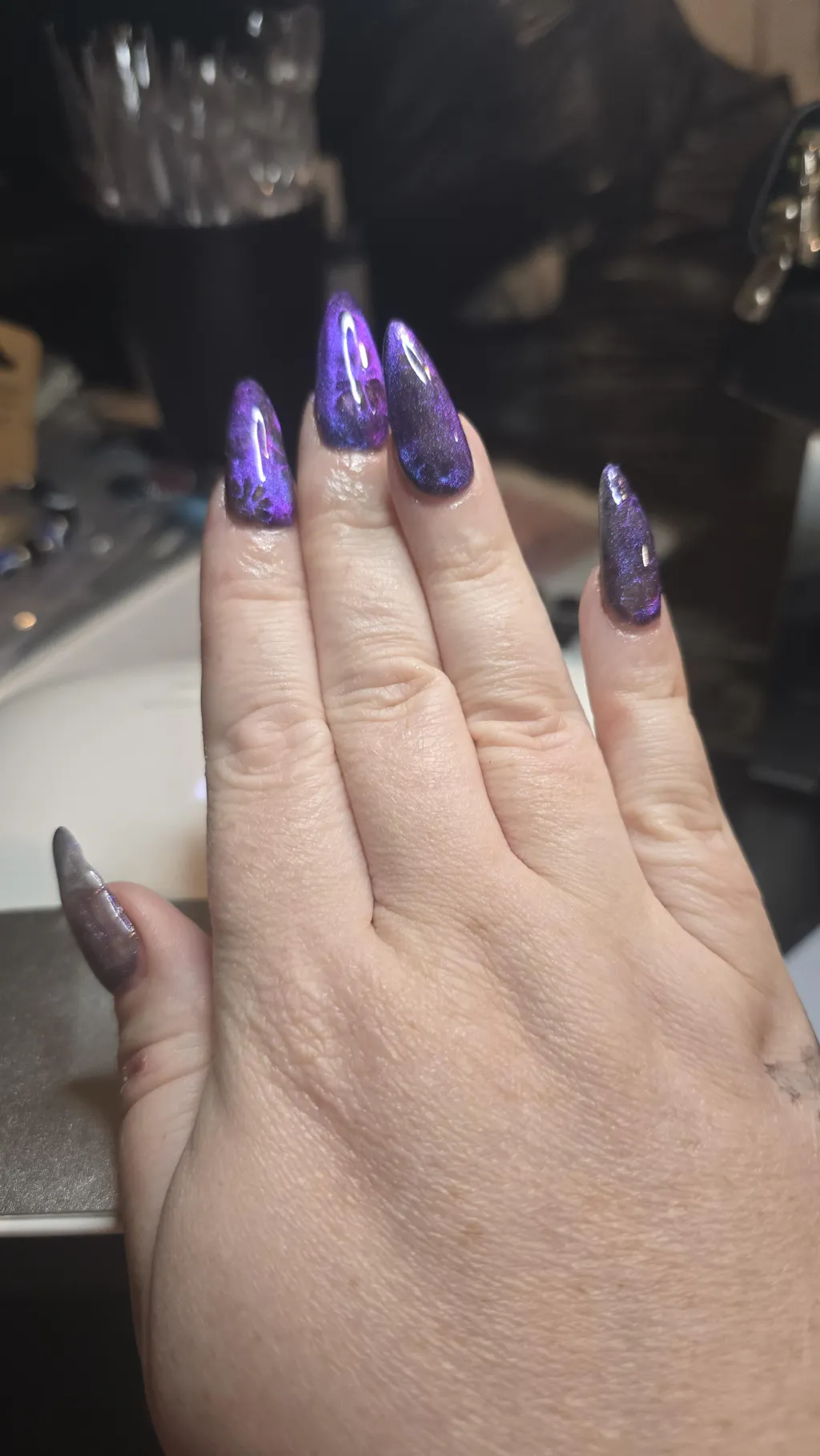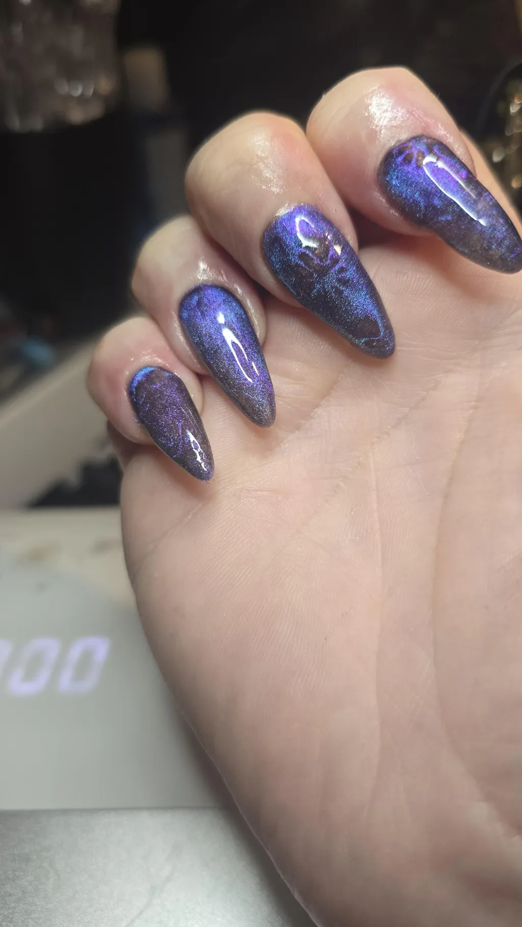 **A small amount of magnetic particles can be left in the inhibition layer of the gel polish after curing and these can be picked up by the top coat. If this occurs simply re-magnetise these few particles after applying top coat and before curing. Alternatively remove the inhibition layer before applying top coat by using IPA or an IPA based product on a lint free wipe and thoroughly wiping over.
